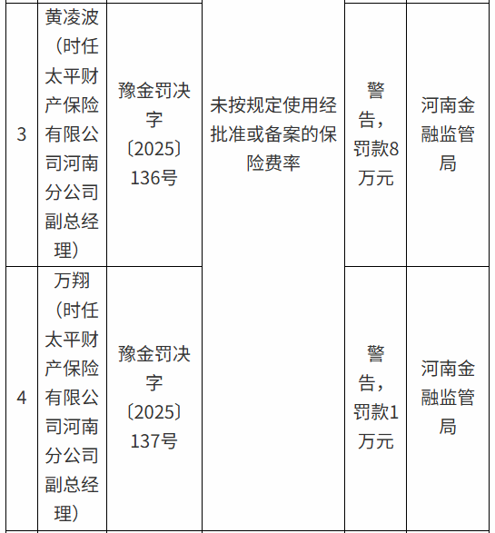 因未按照规定使用经批准或者备案的保险费率,时任太平财险河南分公司总经理助理单明军、副总经理黄凌波、副总经理万翔受到警告,并分别被罚10万元、8万元、1万元。