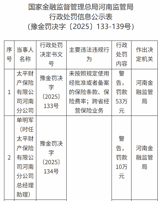 【大河财立方消息】7月31日,河南金融监管局披露的行政处罚信息公示表,因未按照规定使用经批准或者备案的保险条款、保险费率,跨省经营保险业务,太平财产保险有限公司河南分公司受到警告,并被罚款53万元。