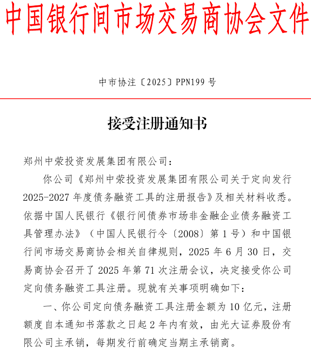 【大河财立方消息】7月31日消息,郑州中荥投资发展集团获批注册10亿元定向债务融资工具,注册额度自2025年6月30日起2年内有效,由光大证券主承销,每期发行前确定当期主承销商。