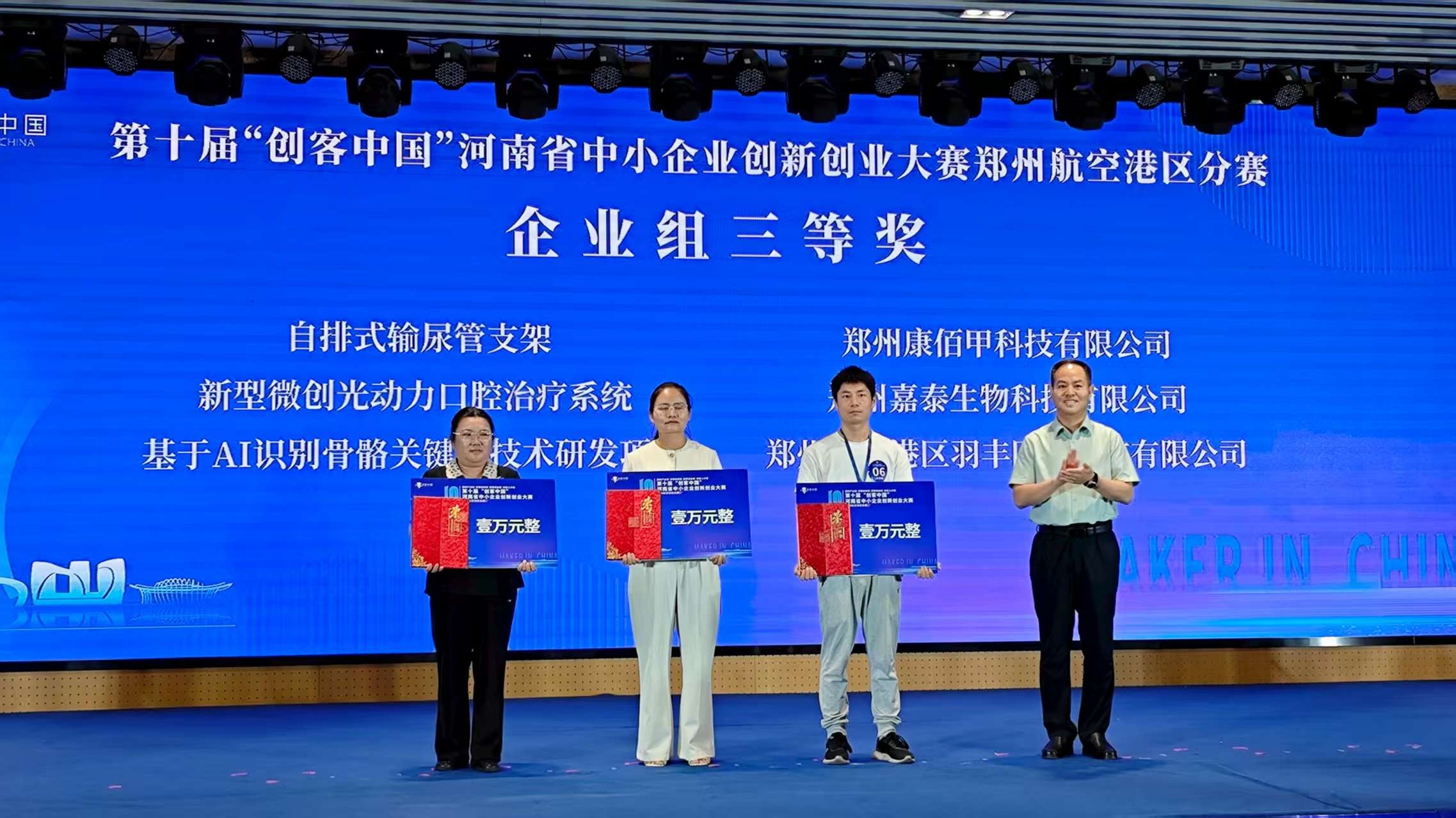 河南健康广济生物技术有限公司的“止血先锋,救死扶伤——动脉止血行业的引领者”项目,河南福申电子科技有限公司的“全球化全栈式传感智造平台”项目,郑州外星舱医疗设备有限公司“双周期脊柱三维减压矫治技术的研究”项目,郑州康佰甲科技有限公司的“自排式输尿管支架”项目,郑州嘉泰生物科技有限公司的“新型微创光动力口腔治疗系统”项目,郑州航空港区羽丰医疗科技有限公司的“基于AI识别骨骼关键点技术研发项目”分别获得企业组一、二、三等奖。