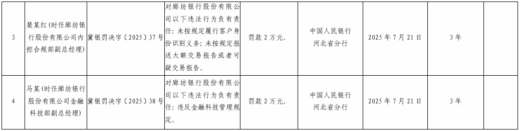时任廊坊银行内控合规部副总经理裴某红对未按规定履行客户身份识别义务;未按规定报送大额交易报告或者可疑交易报告负有责任,被罚2万元。