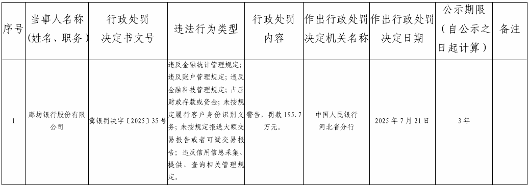 【大河财立方消息】8月1日消息,中国人民银行河北省分行近日披露的行政处罚信息显示,因存在多项违法行为,廊坊银行被警告,并被罚款195.7万元。