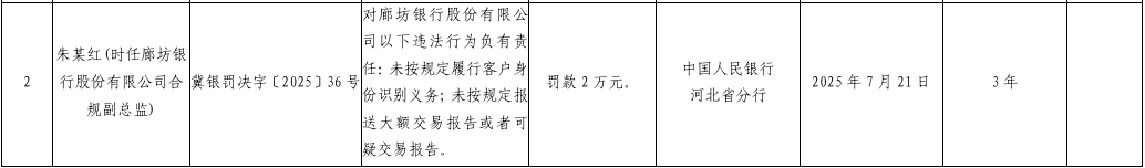 时任廊坊银行合规副总监朱某红对未按规定履行客户身份识别义务;未按规定报送大额交易报告或者可疑交易报告负有责任,被罚2万元。
