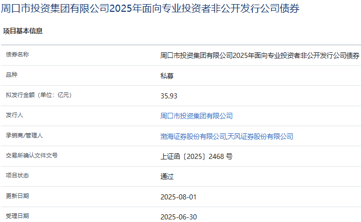 【大河财立方消息】8月1日,周口市投资集团有限公司2025年面向专业投资者非公开发行公司债券项目获上交所通过。债券拟发行金额35.93亿元,承销商/管理人为渤海证券、天风证券。