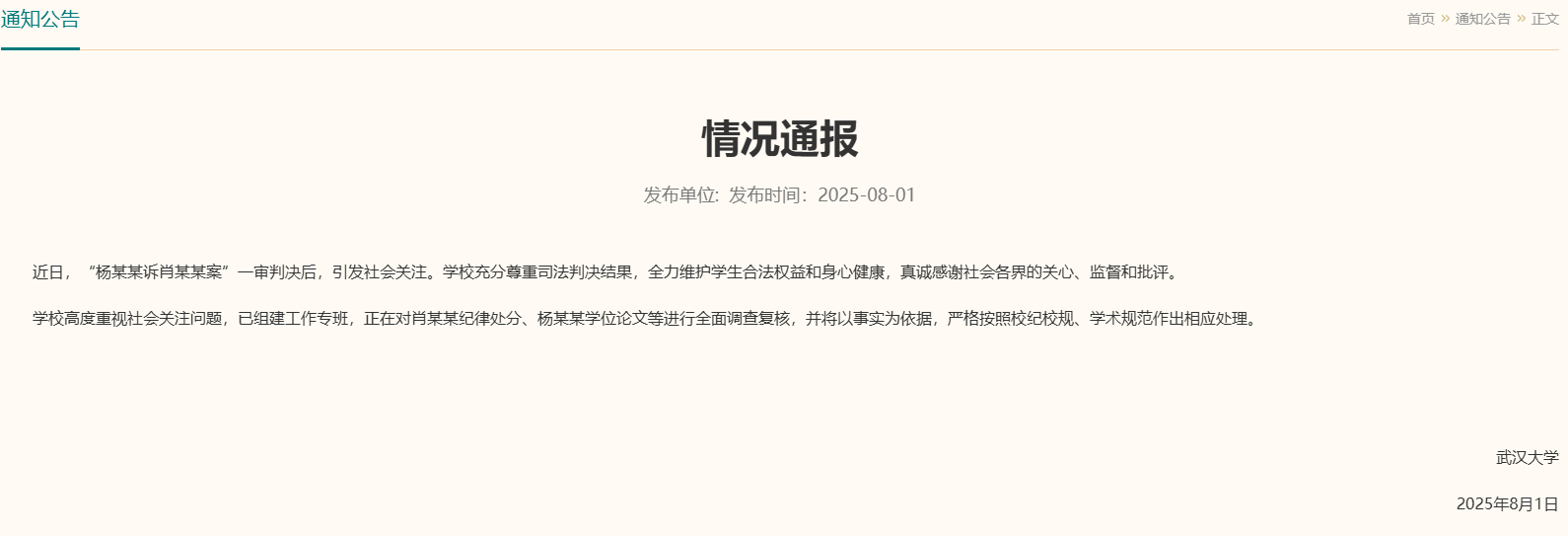 武汉大学情况通报中称,近日,“杨某某诉肖某某案”一审判决后,引发社会关注。学校充分尊重司法判决结果,全力维护学生合法权益和身心健康,真诚感谢社会各界的关心、监督和批评。