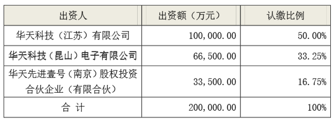 拟新设公司注册资本总额20亿元,其中华天江苏认缴出资10亿元,占比50%,华天昆山认缴出资6.65亿元,占比33.25%,先进壹号认缴出资3.35亿元,占比16.75%。其中,华天江苏以现金及机器设备、土地房产等方式出资,华天昆山及先进壹号以现金方式出资。现金方式出资的资金来源为自有资金。