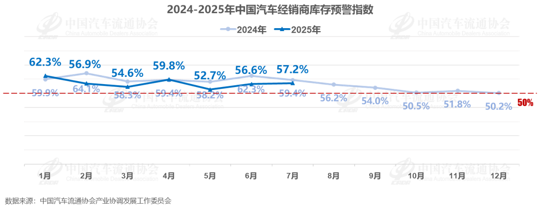 【大河财立方 记者 张克瑶】7月31日,中国汽车流通协会发布的最新一期“中国汽车经销商库存预警指数调查”VIA(Vehicle Inventory Alert Index)显示,2025年7月中国汽车经销商库存预警指数为57.2%,同比下降2.2个百分点,环比上升0.6个百分点。