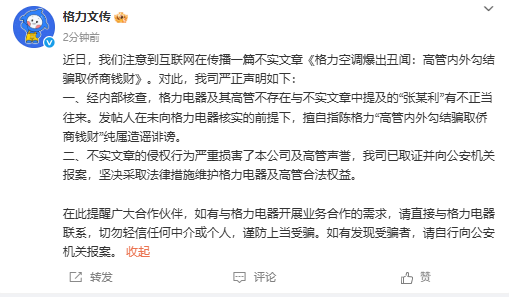 声明中提到,经内部核查,格力电器及其高管不存在与该文章中提及的“张某利”有不正当往来。“发帖人在未向格力电器核实的前提下,擅自指陈格力‘高管内外勾结骗取侨商钱财’纯属造谣诽谤。”格力电器称。