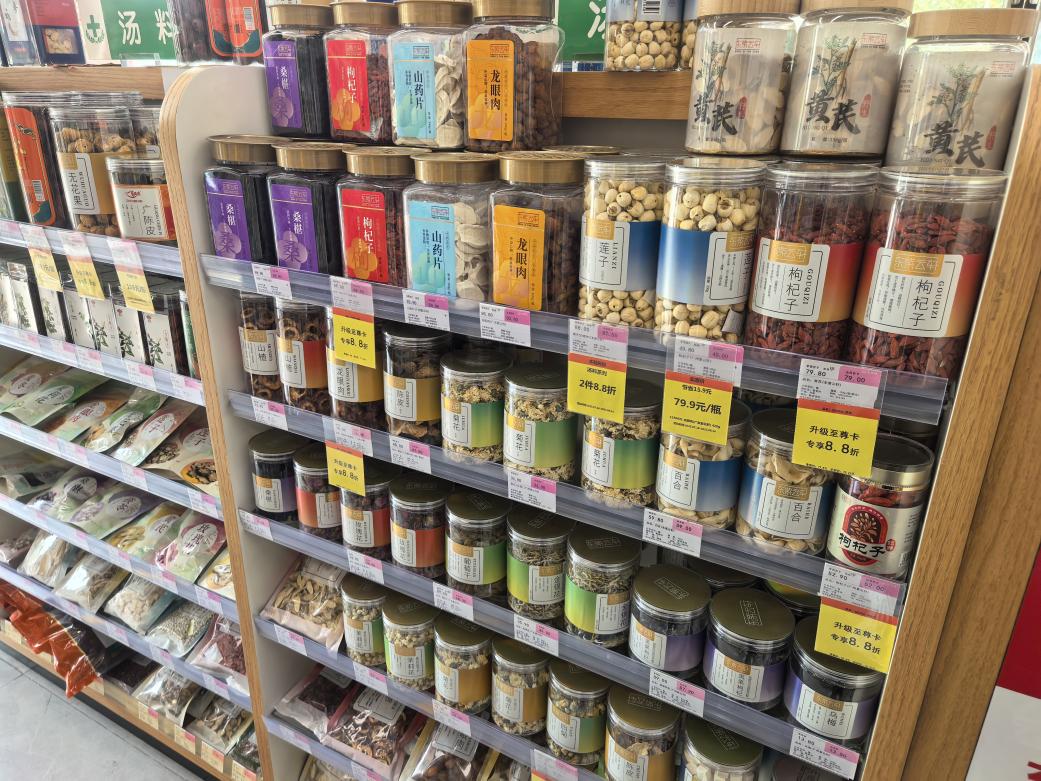 8月1日,大河财立方记者在郑州市一家上市连锁药店大参林旗下店铺看到,货架上摆放着陈皮、菊花、茉莉花、枸杞、黄芪、茯苓等各式各样的中药饮片,大多以透明的密封罐或密封袋包装。