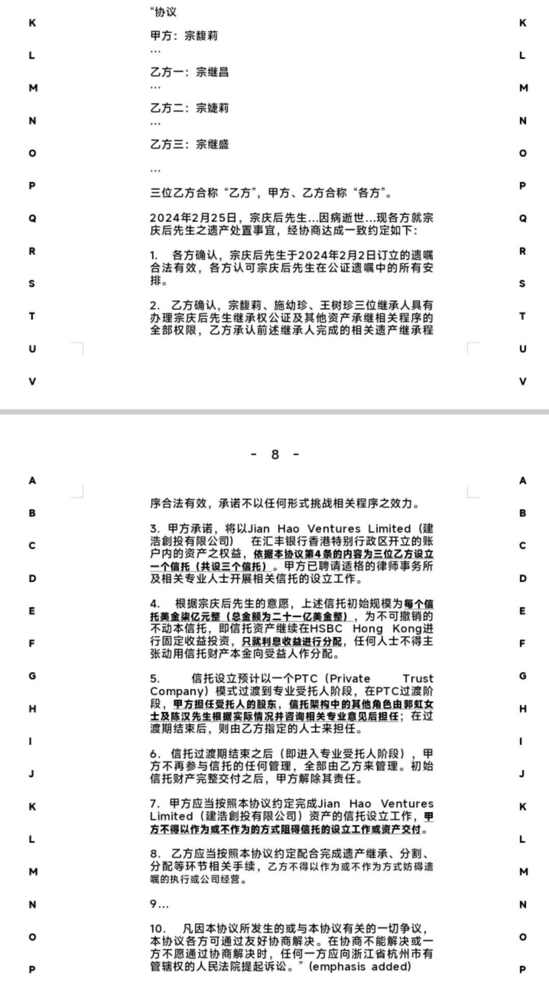 根据原告方提交的文件,2024年3月14日,宗馥莉与三位原告就宗庆后遗产处置事宜达成了一致约定,信托初始规模为每个信托7亿美金,总金额为21亿美元。