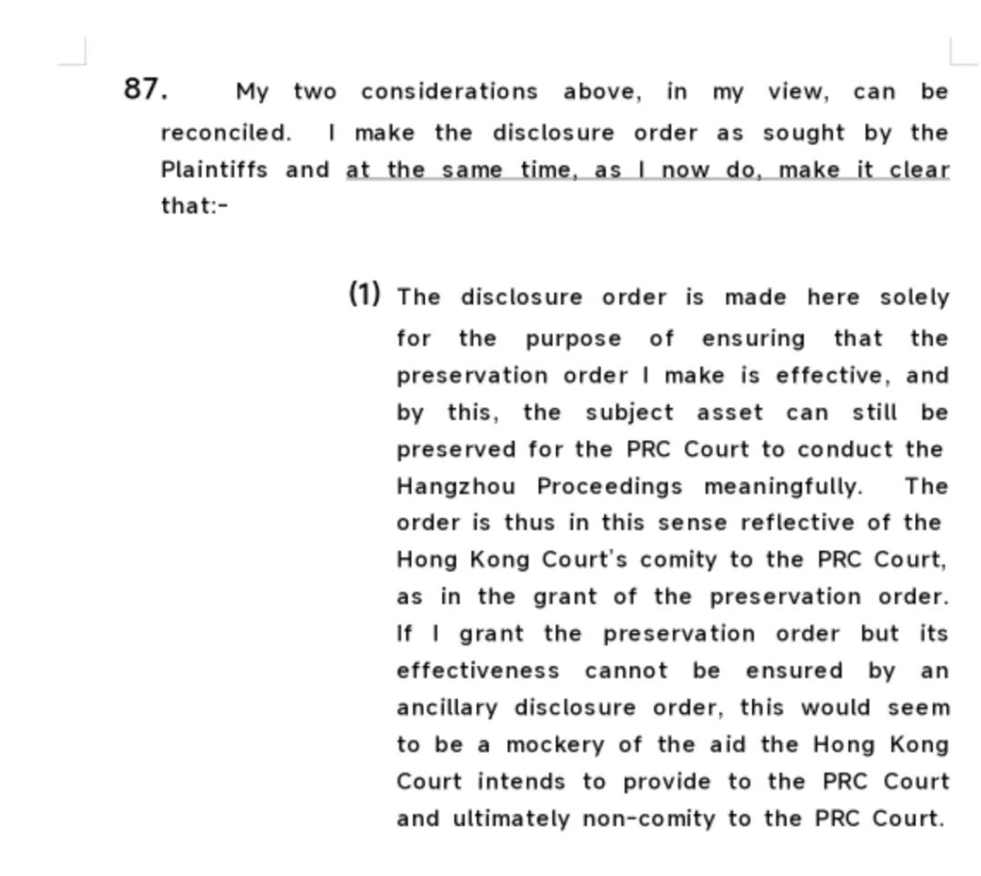 香港高院维持了原告的主张,法官认为保全令有助于确保杭州诉讼案的顺利进行,同时表示这不会对该案件的最终结果或中间裁决产生任何影响。