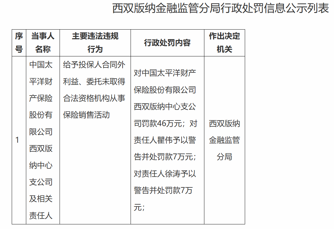 【大河财立方消息】8月2日消息,西双版纳金融监管分局披露的行政处罚信息公示列表显示,因给予投保人合同外利益、委托未取得合法资格机构从事保险销售活动,中国太平洋财产保险股份有限公司西双版纳中心支公司被罚46万元。