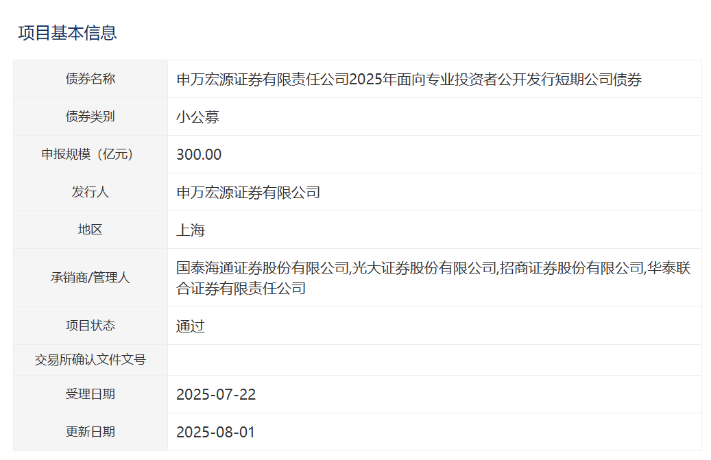 【大河财立方消息】8月2日消息,申万宏源证券有限责任公司2025年面向专业投资者公开发行短期公司债券已获深交所通过。本期债券拟发行金额300亿元,承销商/管理人为国泰海通证券、光大证券、招商证券、华泰联合证券。