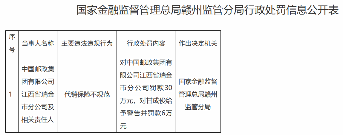 【大河财立方消息】8月2日消息,国家金融监督管理总局赣州监管分局披露的行政处罚信息公开表显示,因代销保险不规范,中国邮政集团有限公司江西省瑞金市分公司被罚30万元。