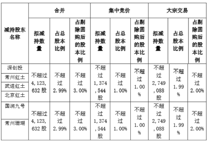 国润九号、常州珊瑚计划自公告披露之日起15个交易日后的连续90个自然日内通过集中竞价交易和/或大宗交易方式减持其持有的公司股份不超过412.36万股,占公司目前总股本的2.99%,占目前剔除公司回购专用账户中的股份数量后总股本的3.00%。