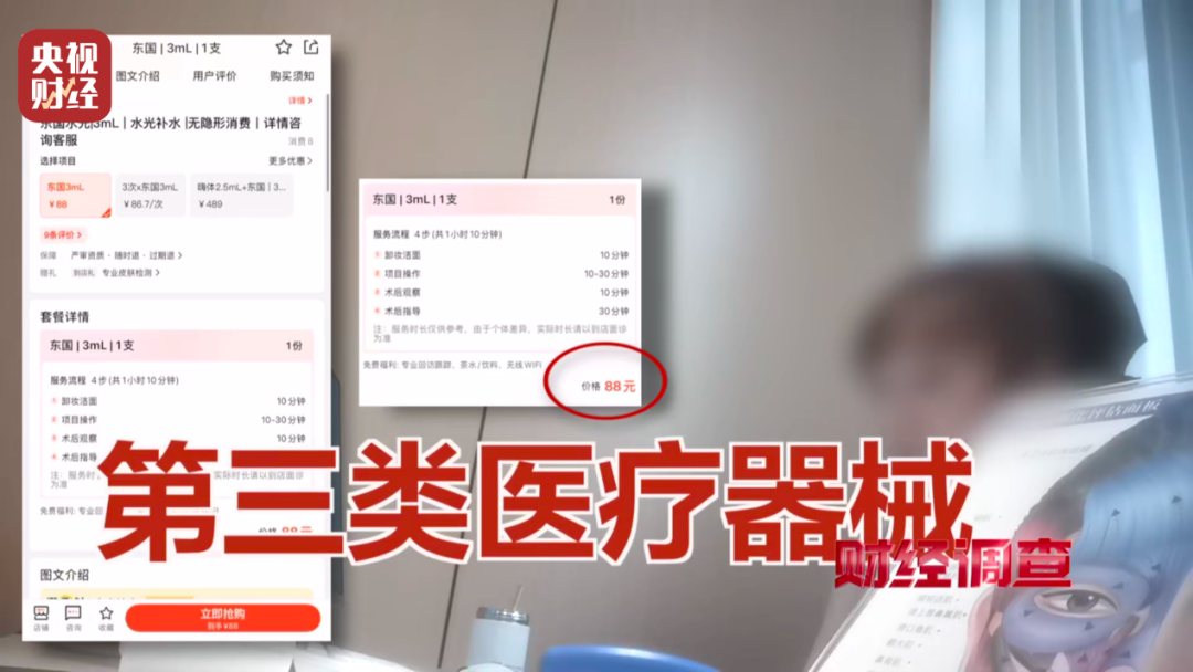 《财经调查》记者在连云港的薇缇医疗美容店内体验水光针注射时,选择了正规械三类润致娃娃水光针,可在付款时工作人员却以该针剂分量不足、无法打全脸为由,要求记者加购店内这款88元的东国水光产品,还强调其同样拥有械三批号,安全可靠。