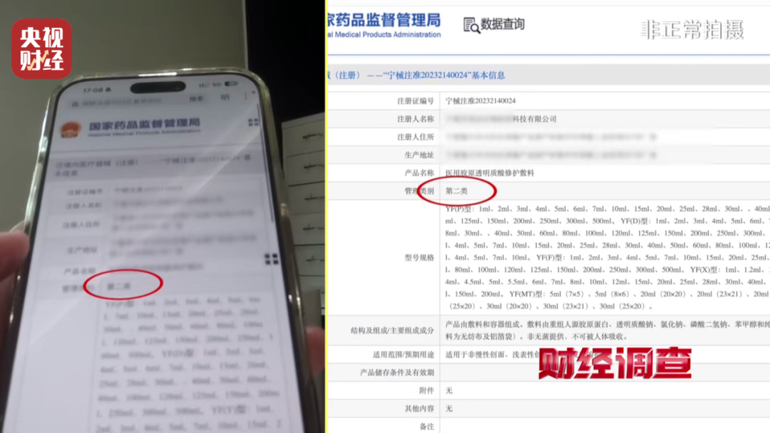 在检验水光针注射剂真伪的环节,记者按照瓶身上的医疗器械注册证编号登上药监局官网进行查验,发现这款“丝丽516动能素”只是械二批号,并不能用于水光针注射。