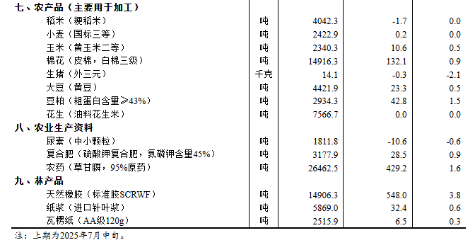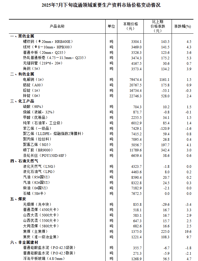 【大河财立方消息】8月4日,国家统计局发布2025年7月下旬流通领域重要生产资料市场价格变动情况。