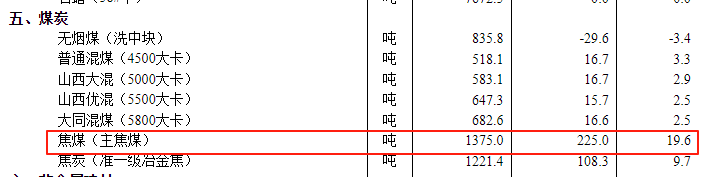 焦煤(主焦煤)报价1375元/吨,较7月中旬上涨225元/吨,涨幅19.6%。