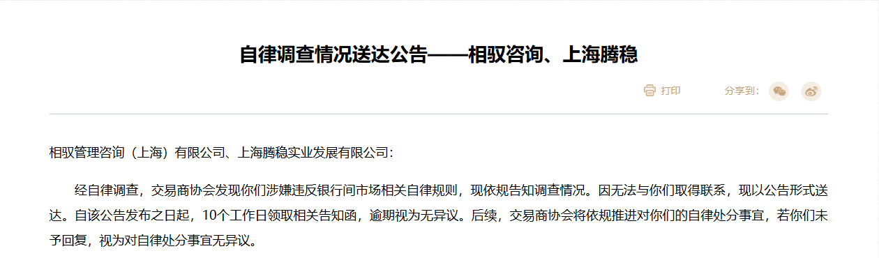 【大河财立方消息】8月4日,交易商协会发布公告称,经自律调查,发现相驭管理咨询(上海)有限公司、上海腾稳实业发展有限公司涉嫌违反银行间市场相关自律规则,并依规告知调查情况。