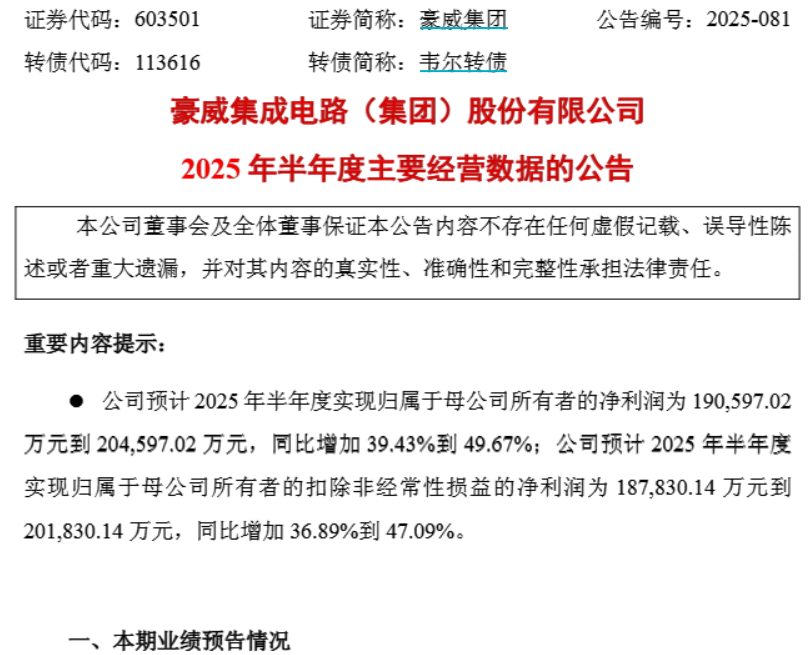 数据显示,豪威集团预计2025年半年度实现归属于母公司所有者的净利润为19.06亿元到20.46亿元,同比增加39.43%到49.67%;预计实现归属于母公司所有者的扣除非经常性损益的净利润为18.78亿元到20.18亿元,同比增加36.89%到47.09%。