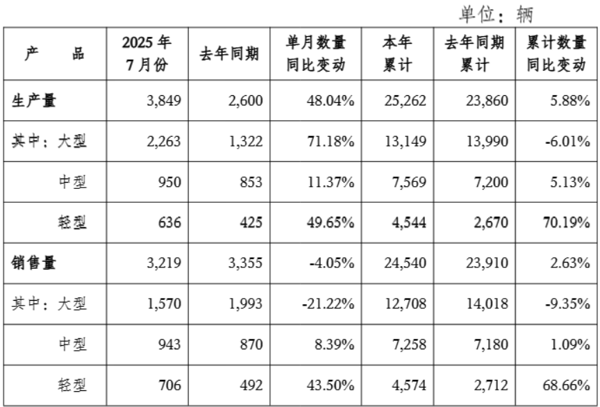 【大河财立方消息】8月4日,宇通客车发布2025年7月份产销数据快报。