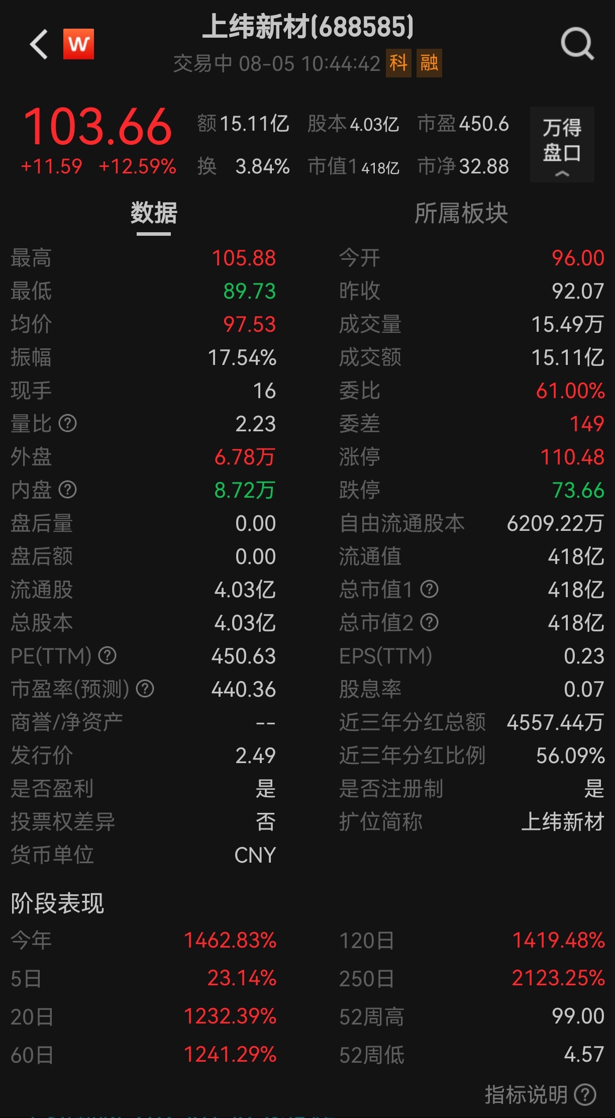 【大河财立方消息】8月5日早盘,年内首只“10倍牛股”上纬新材(688585.SH)复牌后再度强势拉升,盘初一度大涨15%,股价突破百元关口至105.88元,总市值突破400亿元,创历史新高。截至10时44分,该股涨幅收窄至12.59%,成交额超15亿元。今年以来,上纬新材累计涨幅已超1400%,成为A股市场最受瞩目的“妖股”之一。