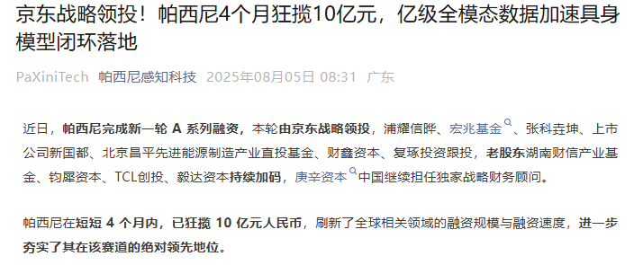 帕西尼称其在4个月内已收揽10亿元,刷新了全球相关领域的融资规模与融资速度,进一步夯实了其在该赛道的绝对领先地位。