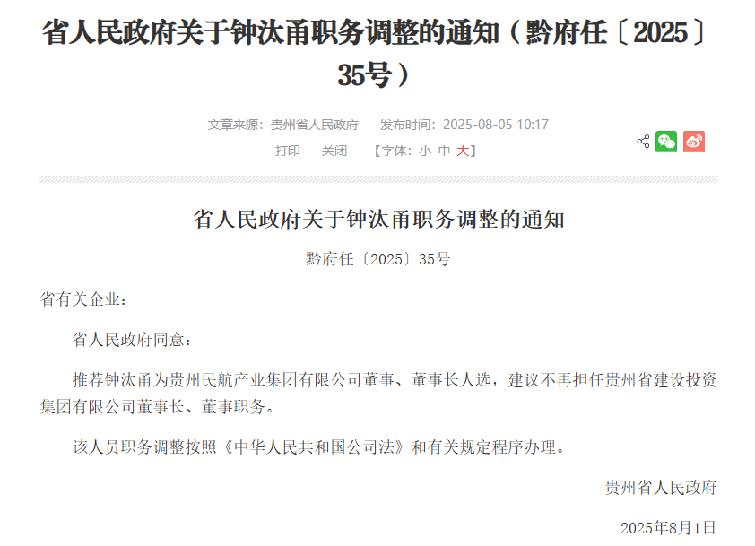 【大河财立方消息】8月5日,贵州省人民政府发布关于钟汰甬职务调整的通知。推荐钟汰甬为贵州民航产业集团有限公司董事、董事长人选,建议不再担任贵州省建设投资集团有限公司董事长、董事职务。