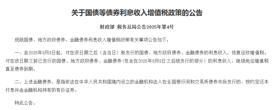【大河财立方 记者 孙凯杰】8月1日,财政部、税务总局联合发布公告,自2025年8月8日起,对在该日期之后(含当日)新发行的国债、地方政府债券、金融债券的利息收入,恢复征收增值税。对在该日期之前已发行的国债、地方政府债券、金融债券(包含在2025年8月8日之后续发行的部分)的利息收入,继续免征增值税直至债券到期。