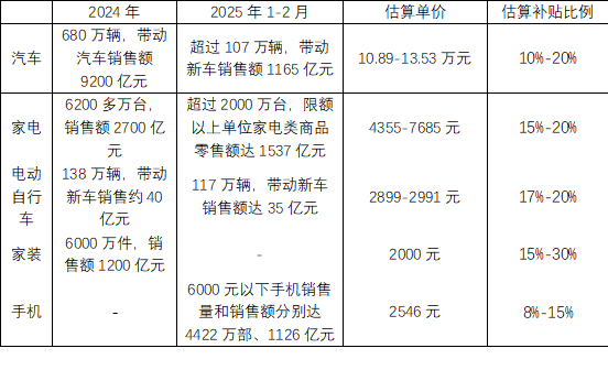 1.实际补贴申领低于顶格金额,汽车置换、手机、平板及手环的补贴估算略高,比如,售价2000-4000元、4000-6000元手机销售量同比分别增长13%、43%,根据手机补贴15%、上限500元倒算,可充分按比例享受补贴的手机金额上限仅为3333元。
