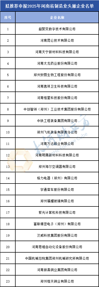 【大河财立方消息】8月5日,郑州市工业和信息化局公示,拟推荐23家企业申报2025年省制造业头雁企业,包括太龙药业、安图生物、恒星科技、宇通客车等。公示时间为2025年8月5日至2025年8月11日。