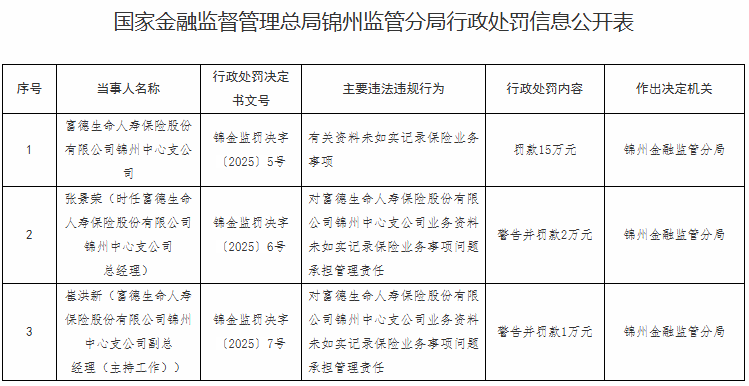 【大河财立方消息】8月6日,国家金融监督管理总局锦州监管分局披露的行政处罚信息公开表显示,富德生命人寿保险股份有限公司锦州中心支公司因有关资料未如实记录保险业务事项,被罚15万元。
