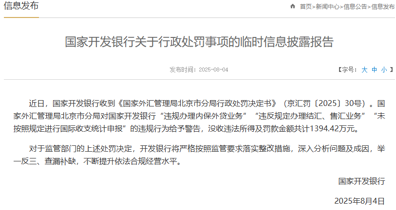 8月4日,国家开发银行发布临时信息披露报告称,对于监管部门的上述处罚决定,国家开发银行将严格按照监管要求落实整改措施,深入分析问题及成因,举一反三、查漏补缺,不断提升依法合规经营水平。