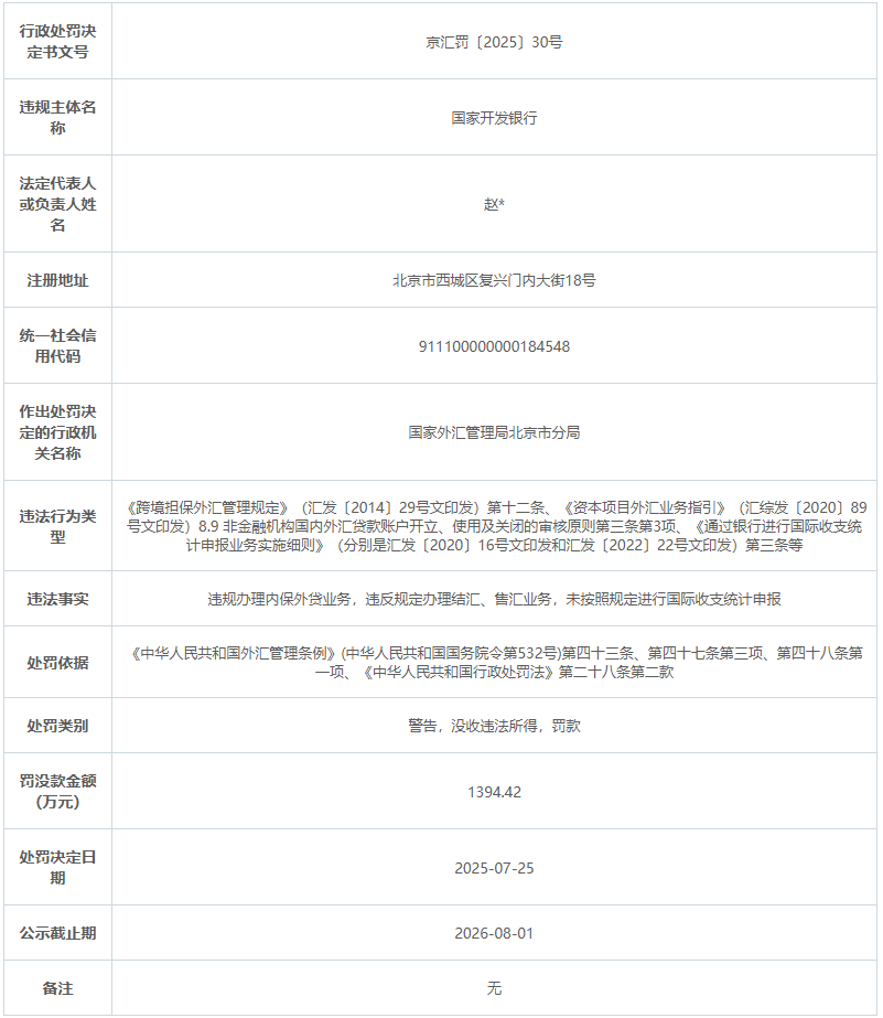 【大河财立方消息】8月6日消息,国家外汇管理局北京市分局近日披露的行政处罚信息显示,因违规办理内保外贷业务,违反规定办理结汇、售汇业务,未按照规定进行国际收支统计申报,国家开发银行被警告,罚没1394.42万元。