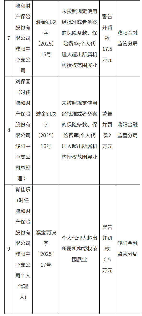 同时,濮阳金融监管分局对时任鼎和保险濮阳中支总经理刘保国给予警告并罚款2万元、时任鼎和保险濮阳中支个人代理人肖佳乐给予警告并罚款0.5万元。