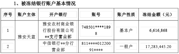 公告显示,石棉县人民法院司法冻结雅安天蓝约2390万元资金。其中,基本银行账户被冻结资金661.69万元,另有一个一般银行账户被冻结资金1728.34万元。