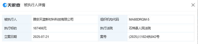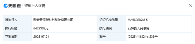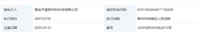 天眼查App显示,7月份,石棉县人民法院分别下发了两份执行裁定书。其中,案号为【(2025)川1824执838号】的文书显示,雅安天蓝被执行6429382元;案号为【(2025)川1824执842号】的文书显示,雅安天蓝被执行187486元,合计执行约6616868元,与天力锂能此次公告中提及的完全一致。