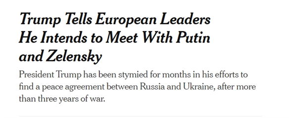 据《纽约时报》6日报道,两位知情人士透露,美国总统特朗普告知欧洲领导人,他计划最早于下周与俄罗斯总统普京进行面对面会晤,随后还计划与普京和乌克兰总统泽连斯基举行三方会谈。
