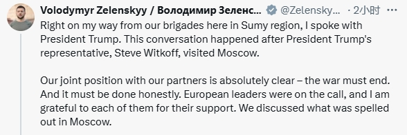 特朗普称,他已经向一些欧洲盟友通报了最新情况,各方同意这场冲突必须结束,他们将在未来几天和几周内努力实现这一目标。