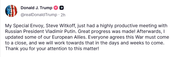 当地时间8月6日,特朗普在其社交媒体“真实社交”发文表示,威特科夫与普京进行了一次富有成效的会谈,并取得了重大进展。