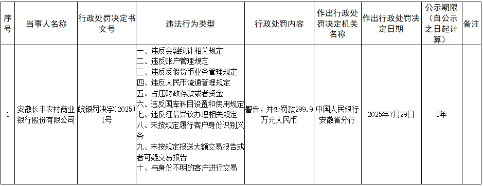 【大河财立方消息】8月7日消息,中国人民银行安徽省分行披露的行政处罚信息显示,安徽长丰农村商业银行因10项违法行为被警告,并处罚款299.9万元。