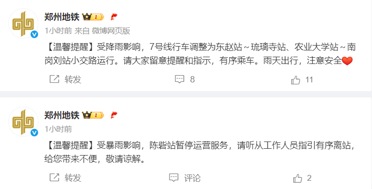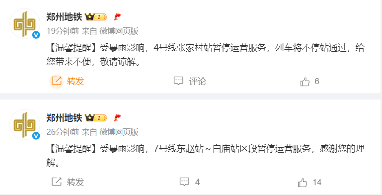 【大河财立方消息】8月7日午间,郑州地铁发布消息,受暴雨影响,4号线张家村站暂停运营服务,7号线东赵站~白庙站区段暂停运营服务,陈砦站暂停运营服务,列车将不停站通过。