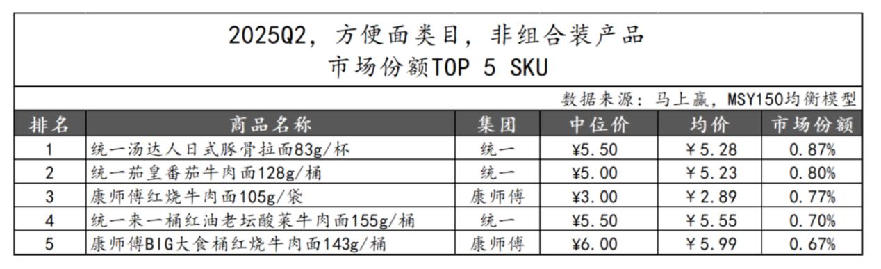 马上赢品牌CT数据显示,今年一季度方便面类目新品在二季度市场份额TOP5 SKU中,白象集团包揽前三,杨掌柜和康师傅分别位列第四、第五名。而在今年二季度非组合装市场份额TOP 5SKU,统一集团则独占三席,凸显出传统主力产品的强大市场统治力。