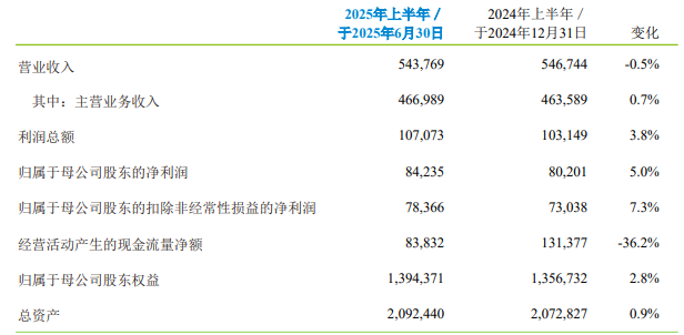 2025年上半年,中国移动实现营业收入人民币5438亿元,其中主营业务收入为人民币4670亿元,同比增长0.7%。总连接数达到38.15亿,净增1.45亿。数字化转型收入达到人民币1,569亿元,同比增长6.6%,占主营业务收入比达到33.6%,同比提升1.9个百分点。归属于母公司股东的净利润为人民币842亿元,同比增长5.0%。