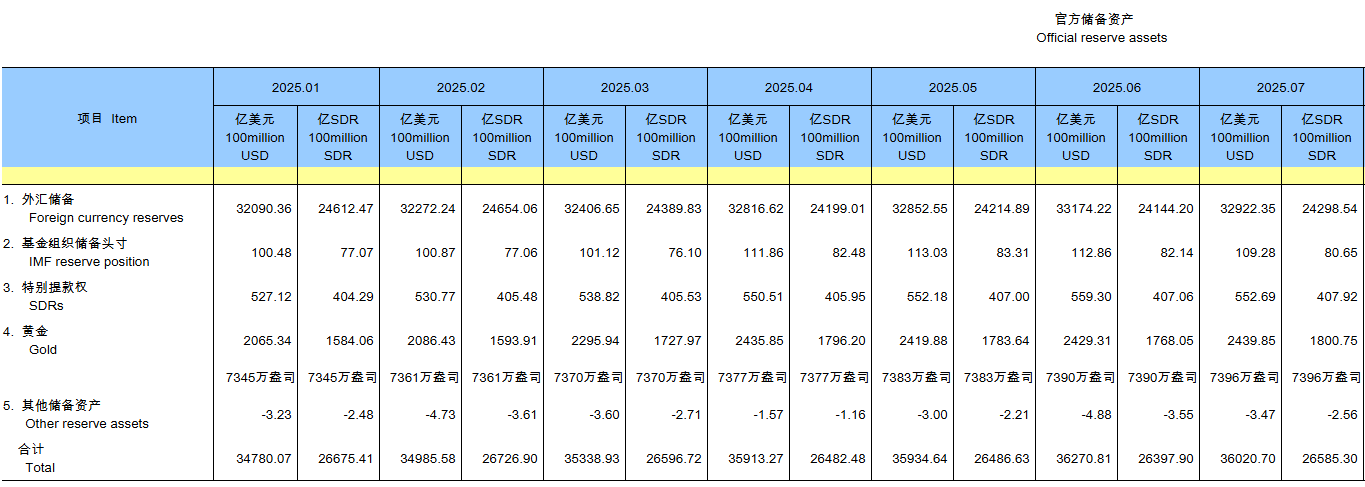 【大河财立方 记者 杨萨】8月7日,国家外汇管理局发布数据显示,截至2025年7月末,我国外汇储备规模为32922亿美元,比6月末下降252亿美元,降幅为0.76%;中国7月末黄金储备报7396万盎司,环比增加6万盎司,为连续第9个月增持黄金。