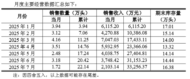 2025年1~7月,公司累计销售生猪22.14万头,同比上升19.93%;累计销售收入3.33亿元,同比上升11.35%。