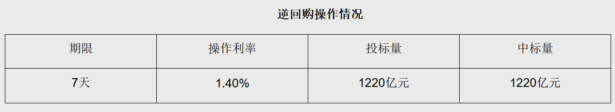【大河财立方消息】8月8日,央行开展1220亿元7天期逆回购操作,投标量1220亿元,中标量1220亿元,操作利率为1.40%,与此前持平。今日有1260亿元逆回购到期,实现净回笼40亿元。
