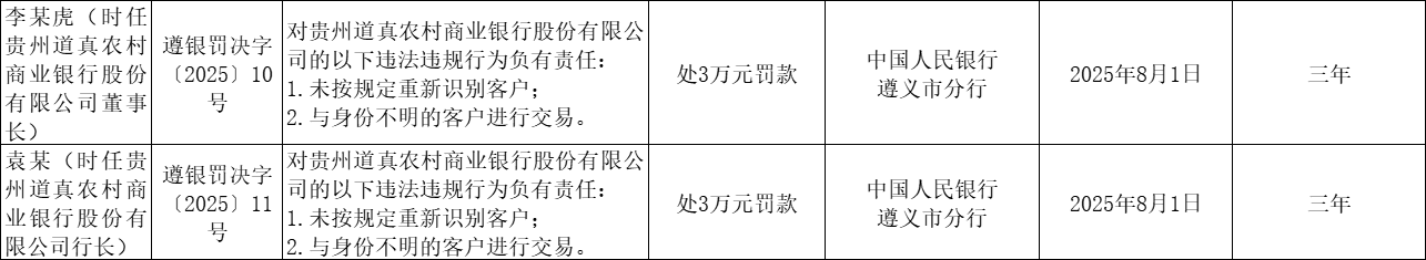 时任该行董事长李某虎、时任该行行长袁某对未按规定重新识别客户;与身份不明的客户进行交易负有责任,二人均被罚款3万元。