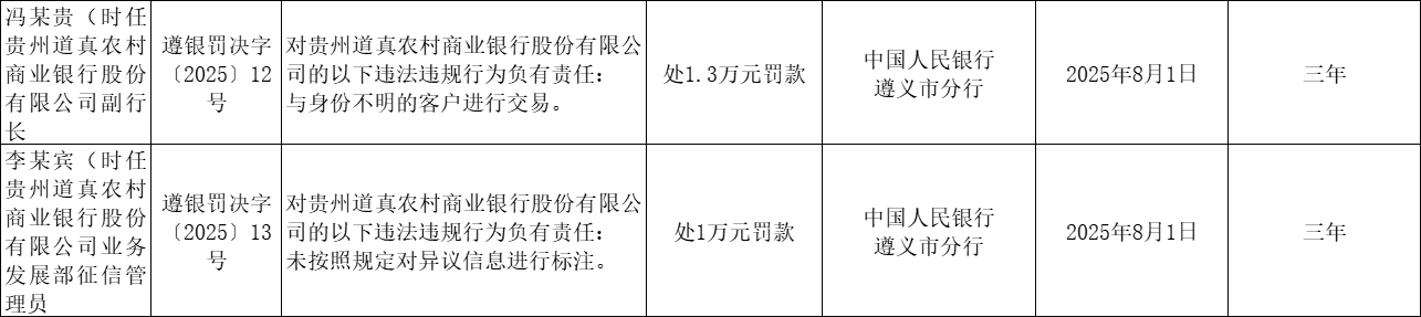 时任该行副行长冯某贵对与身份不明的客户进行交易负有责任,被罚款1.3万元;时任该行业务发展部征信管理员李某宾对未按照规定对异议信息进行标注负有责任,被罚款1万元。